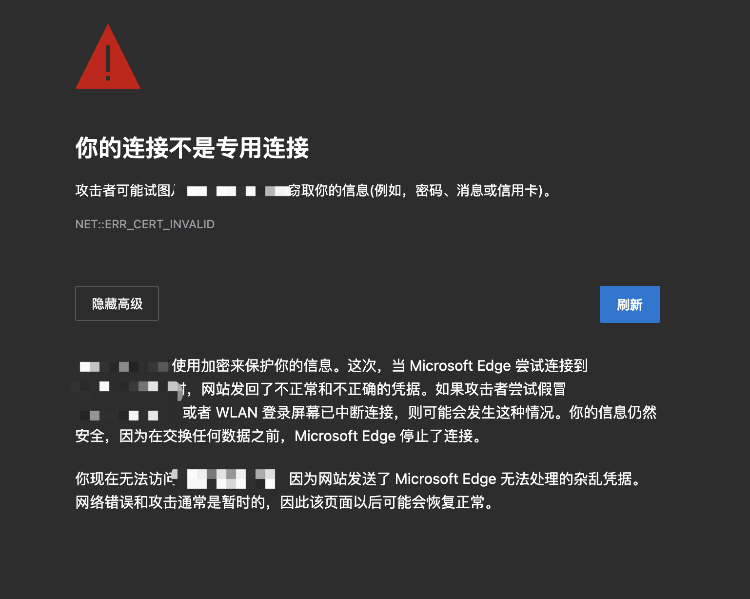 在 Chrome 中,访问不受信任的 HTTPS 网站时,一般会提示如下的提示。这可能是由于证书过期、不匹配或者可能用的是自签名证书等情况。通常点击高级按钮会有一个继续按钮,浏览器就会关闭当前页面警告并继续访问。但在高版本的 Chrome for mac 中,是没有这个继续按钮的。