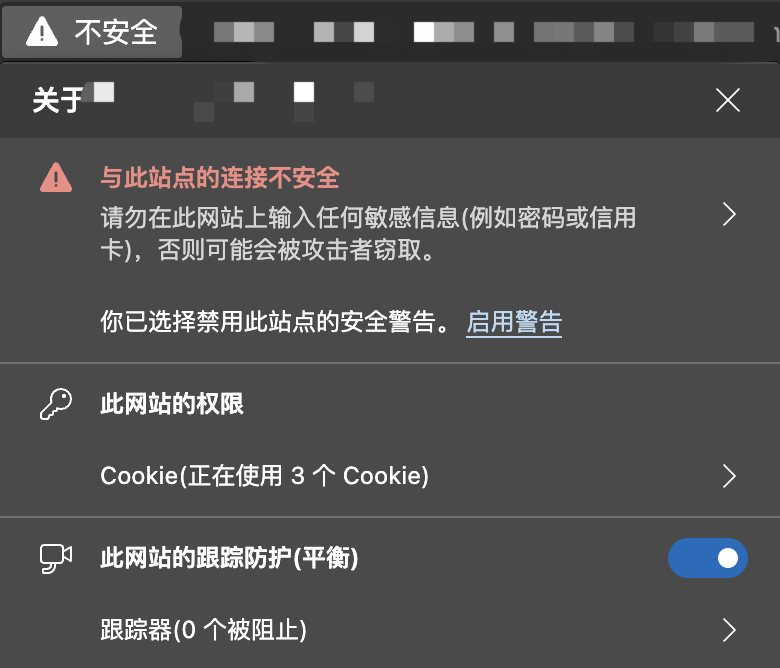 接下来你会发现页面可以正常跳转了,地址栏前面会标记不安全,点击会显示你已选择禁用此站点的安全警告。关闭警告是站点级别的,不会影响到其他网站。如果想要重新打开警告,可以点击下图中的启用警告。