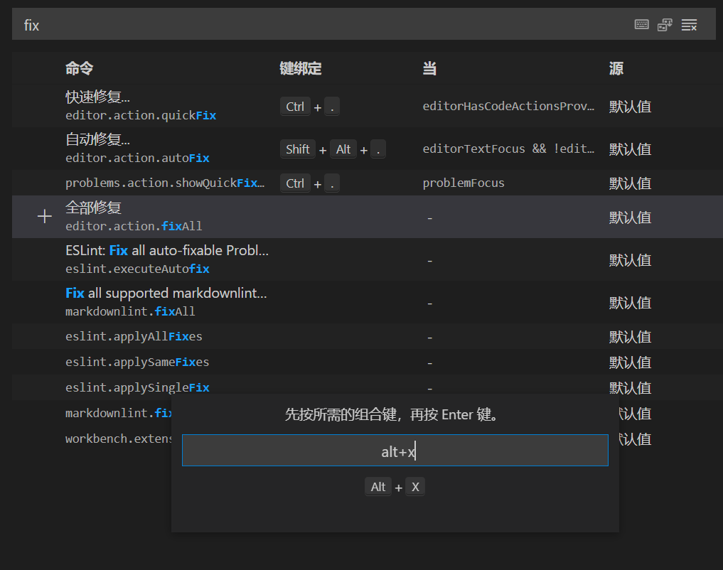 可以看到全部修复也就是修复当前文件的全部错误,是没有绑定快捷键的。点击条目前面的加号,或是双击该条,可以添加和覆盖绑定的快捷键。打开后先按下想要绑定的快捷键再回车,即可保存。右键该条目可以删除或重置键绑定。这边我按照自己的习惯绑定了Alt + X。