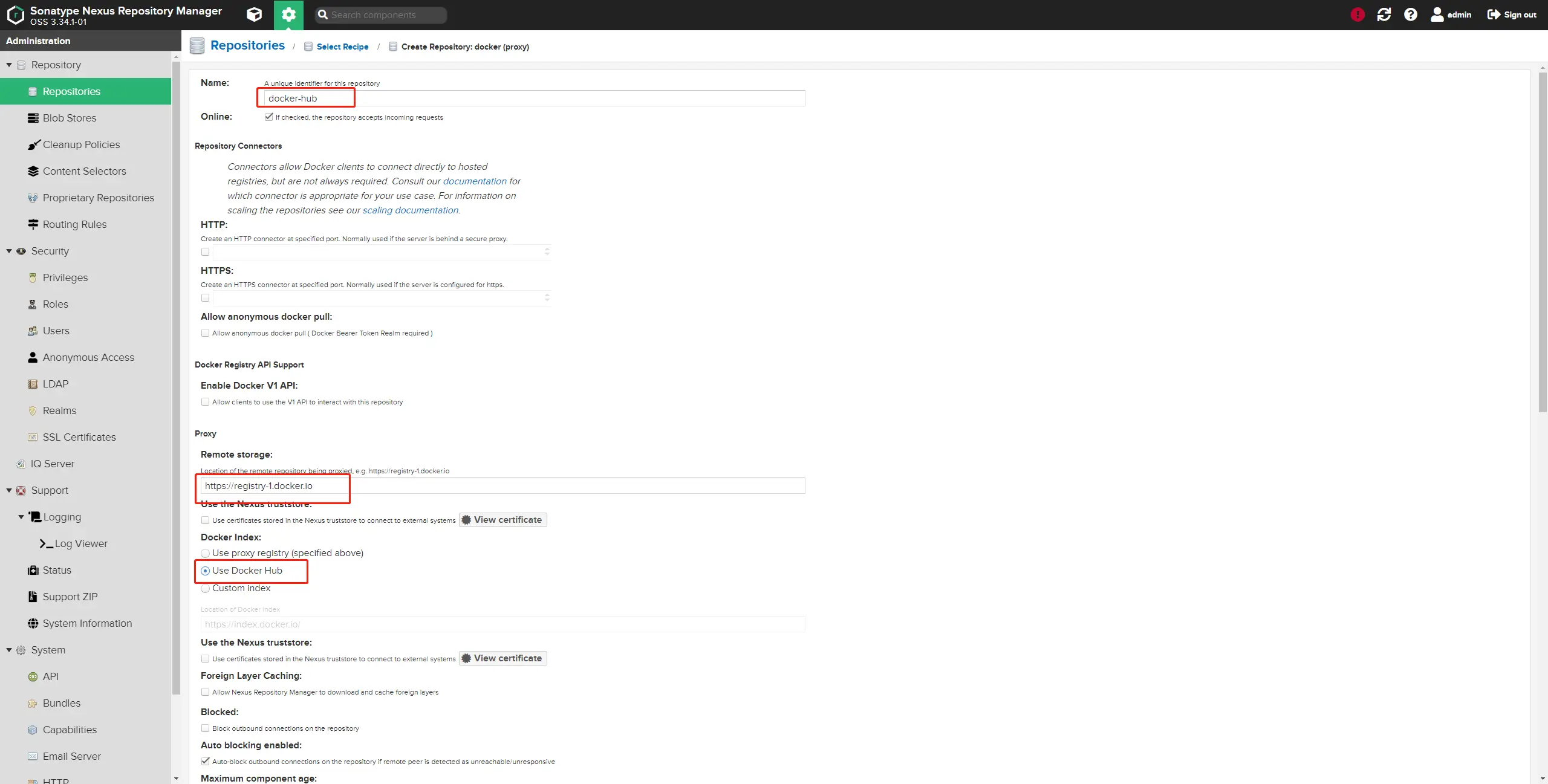 Proxy-Remote storage配置成https://registry-1.docker.ioProxy-Docker Index选择Use Docker Hub,能够保持最新
