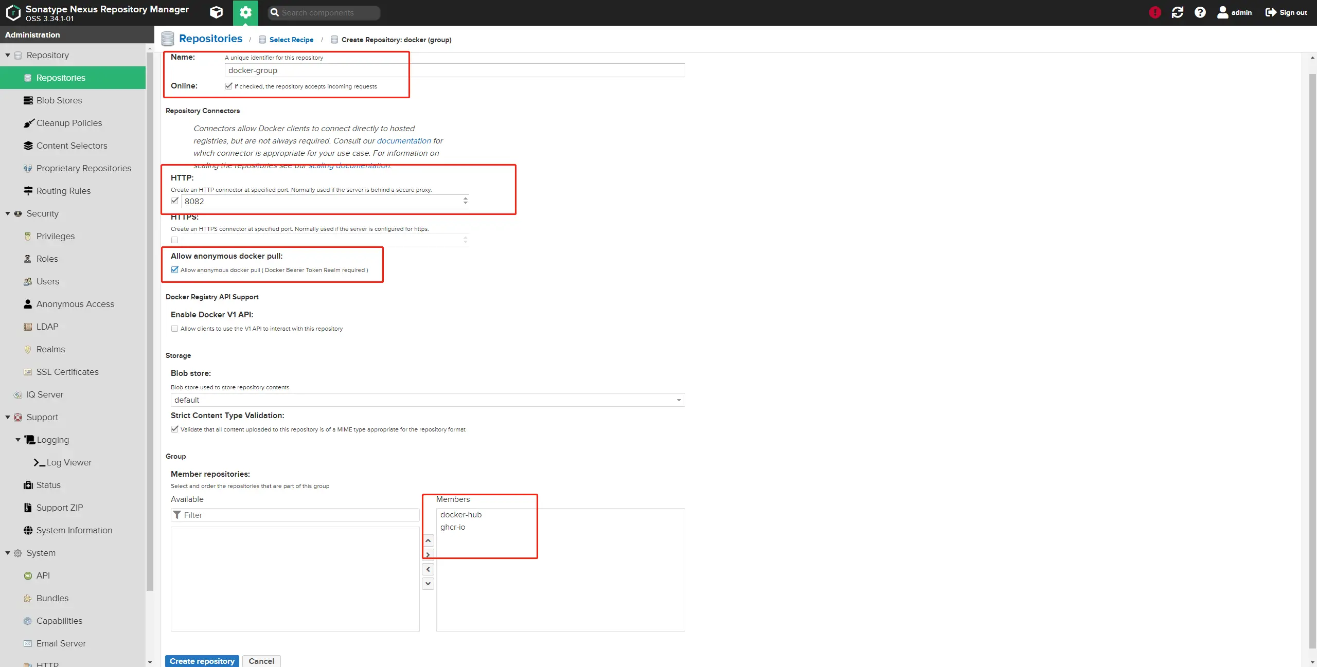 这个 Repository 是我实际访问的仓库,所以要创建一个 http connector,端口自定,只要不是 8081。勾选 Allow anonymous docker pull,允许不登录执行 docker pull。