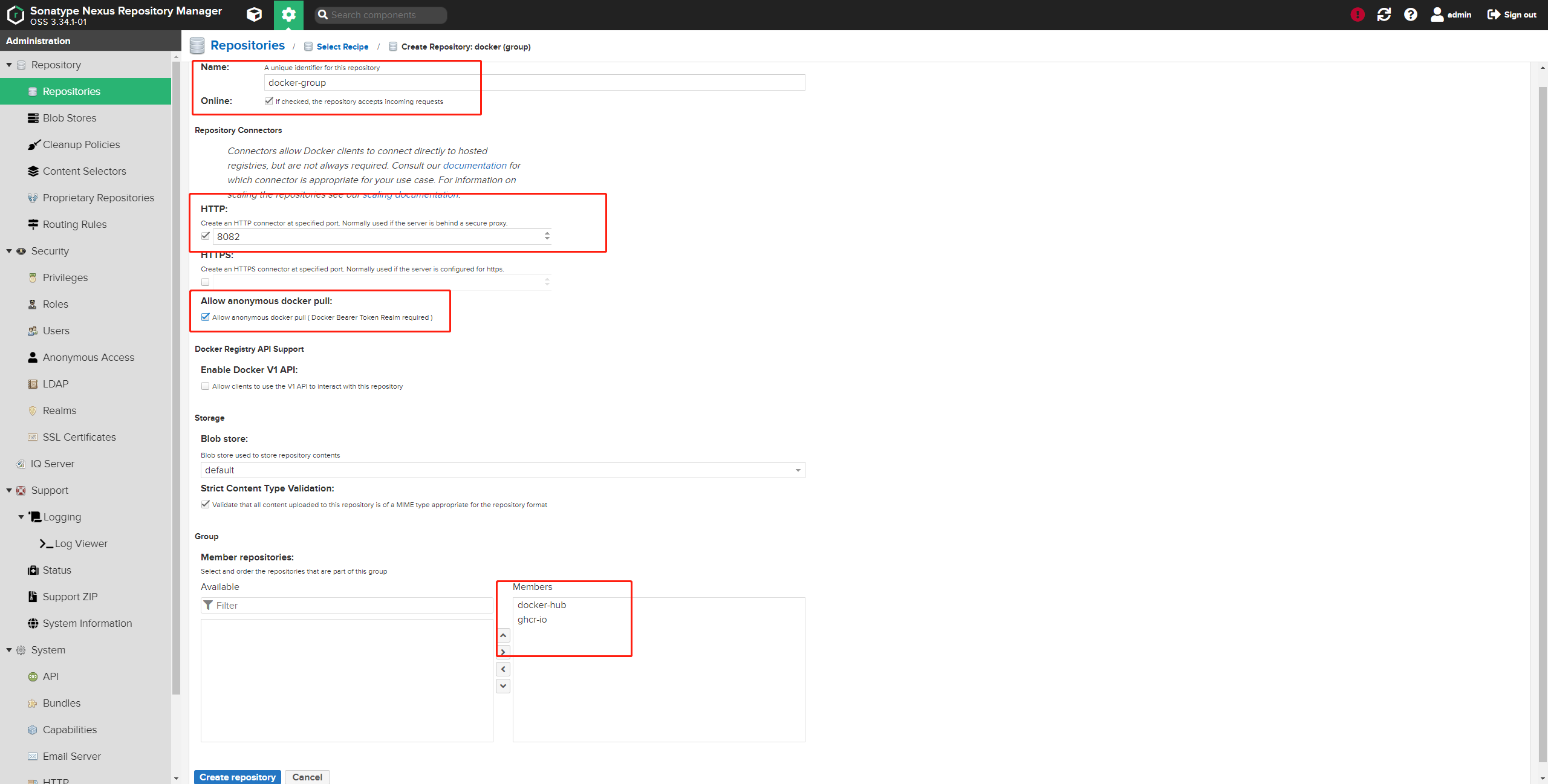 这个 Repository 是我实际访问的仓库,所以要创建一个 http connector,端口自定,只要不是 8081。勾选 Allow anonymous docker pull,允许不登录执行 docker pull。