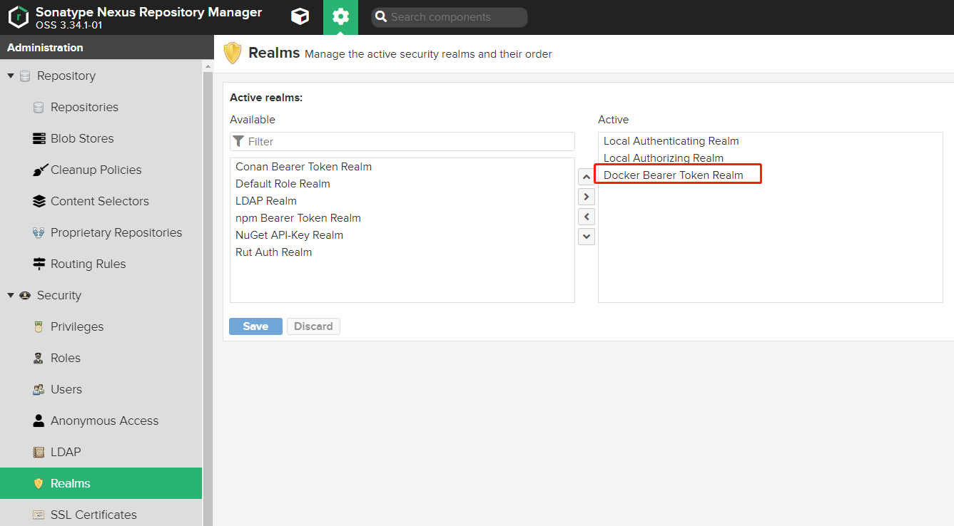 这里要在Security-Realms里面启用Docker Bearer Token Realm,否则 docker 无法使用。