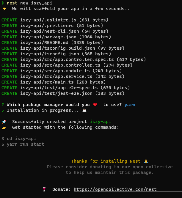 运行如下命令创建项目,nest-cli会根据参数初始化项目文件。接着会让你选择想用的包管理器,npm或yarn,我选择了yarn,因为我感觉国内即使换了源,yarn 似乎也更快一些。