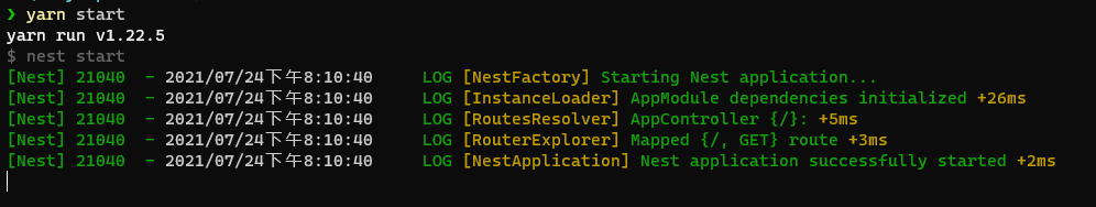 运行yarn start后,NestJS 就会开始运行,当显示Nest application successfully started时,即表示启动完成。