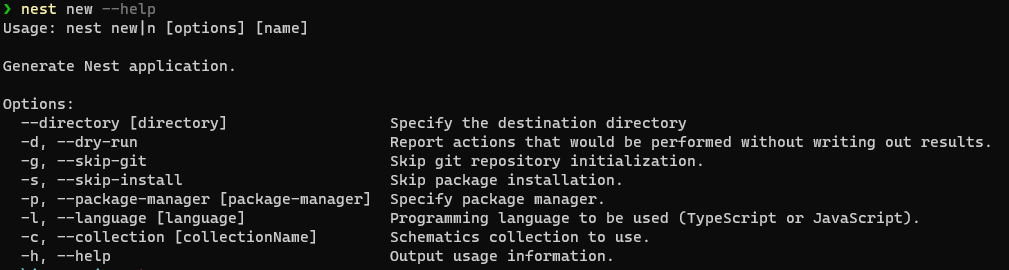 目录结构可以参考 Nest framework TypeScript starter repository,项目就是基于这个创建的。我们可以看到这个模板使用了 TypeScript 语言,NestJS 也是可以基于 JavaScript 运行的,创建时加上参数配置如下所示即可。