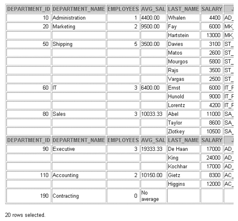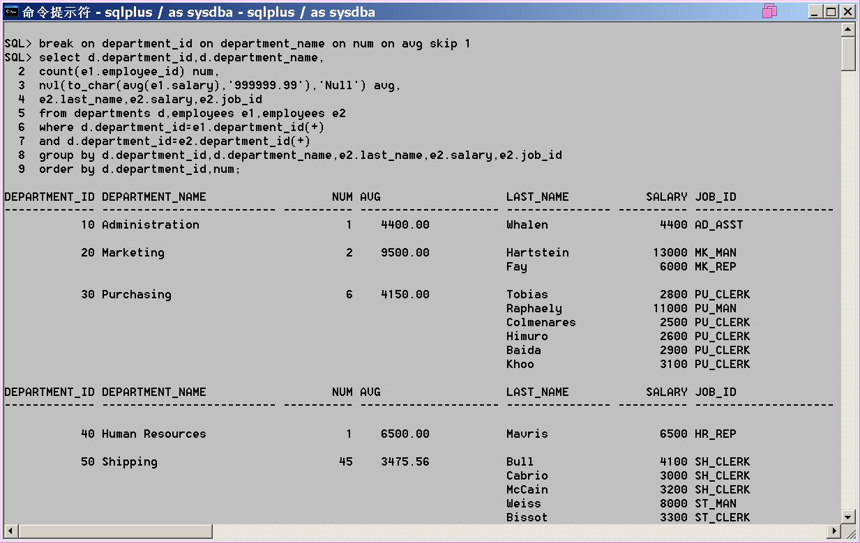 显示所有部门的部门编号、名称、员工数和平均薪金,同时显示在每个部门中工作的员工的姓名、薪金和职务。
