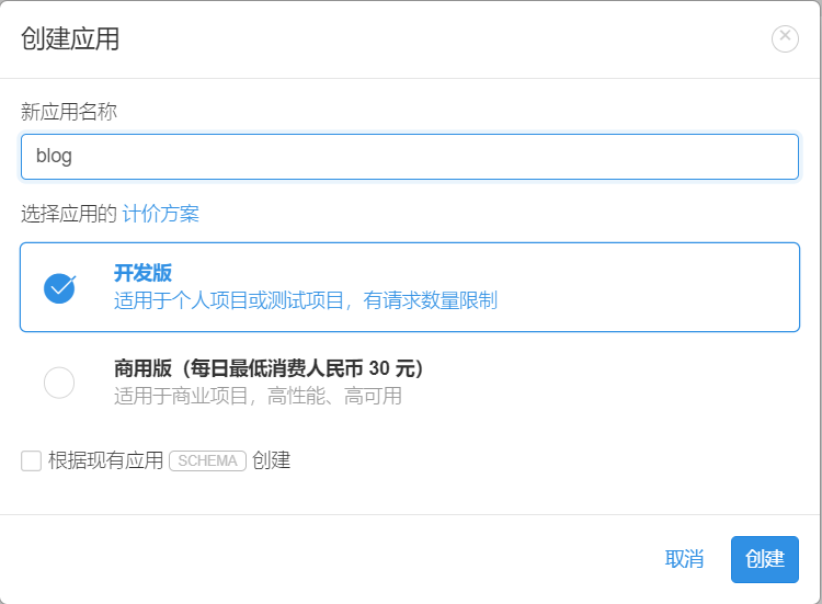 Leancloud - 点击这里创建应用,应用名称随意。