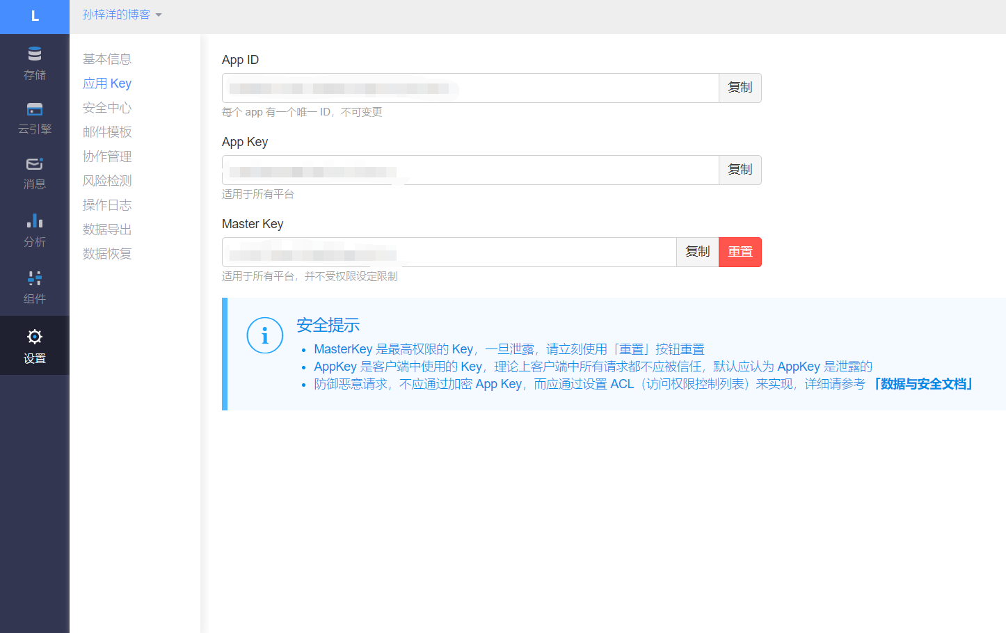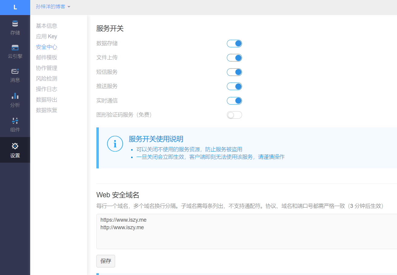 为了数据安全,请务必在此处添加安全域名为你的博客地址。如在本地测试,可以先不添加安全域名。