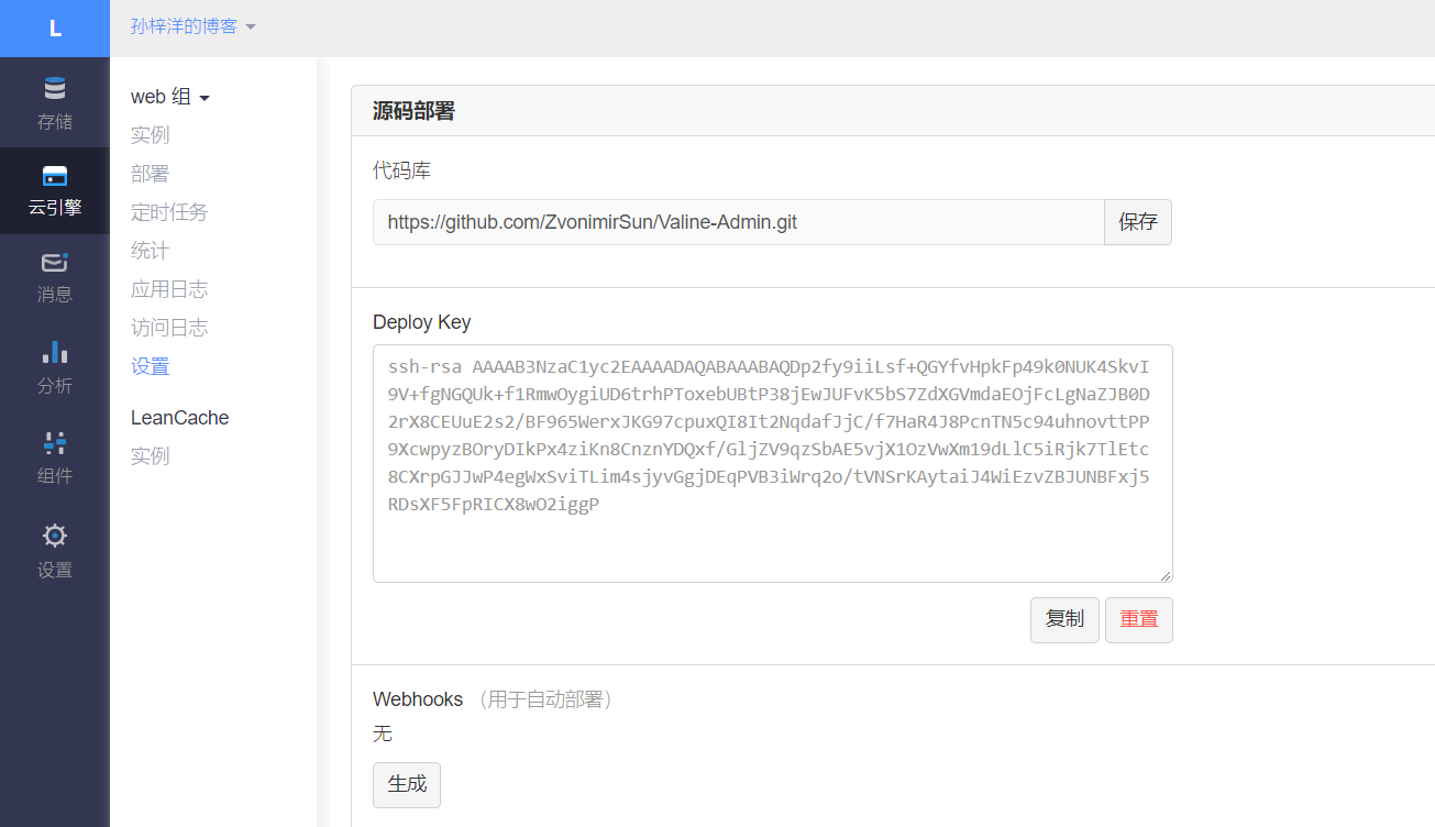 进入博客应用的云引擎的设置,在代码库中填入以下内容并点击保存。已改用 zhaojun1998 的 Valine-Admin,与教程暂不符合,请勿继续使用以下教程。