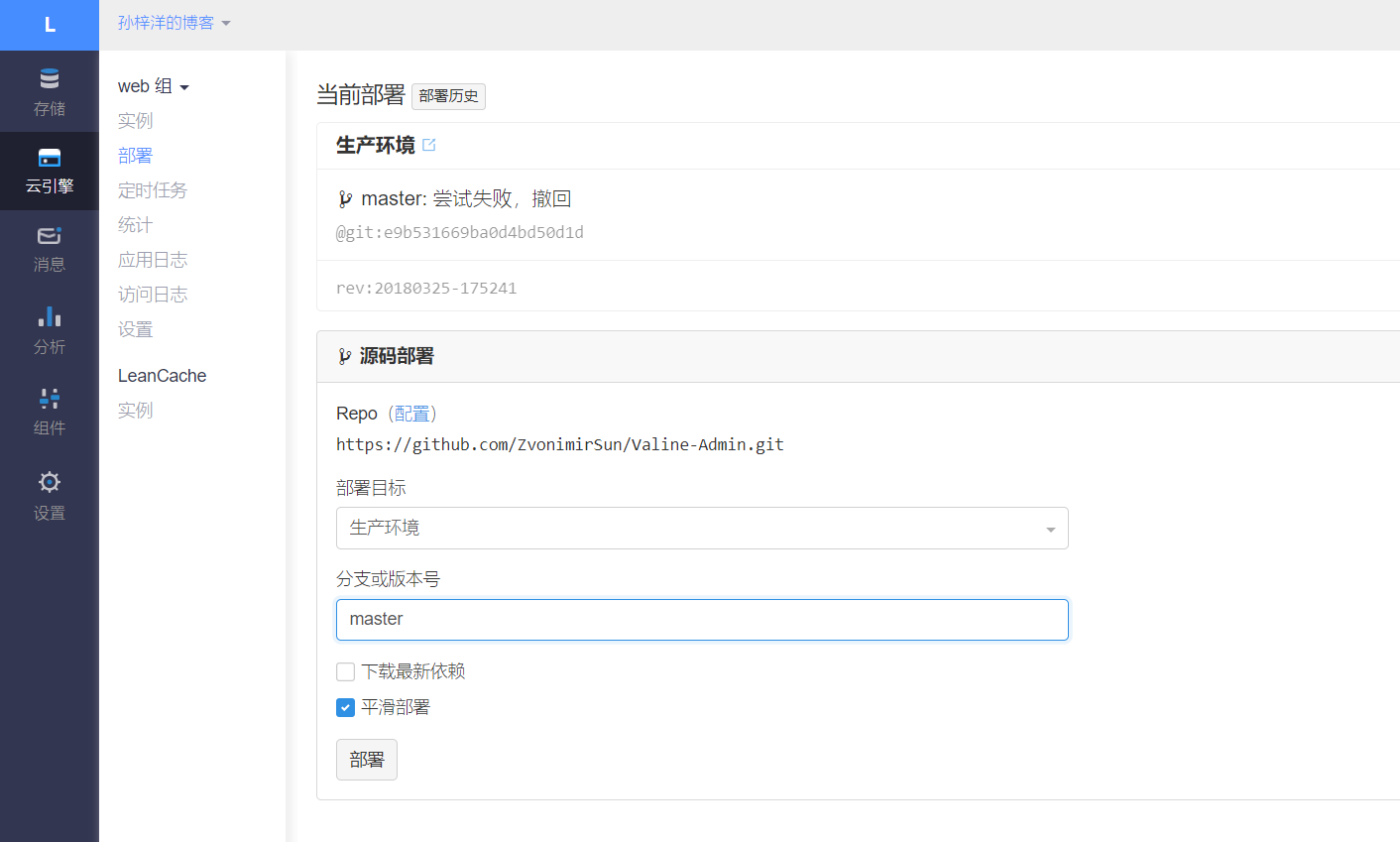 接下来在云引擎的部署页,选择部署目标为生产环境,分支或版本号填入master,勾选平滑部署,点击部署。