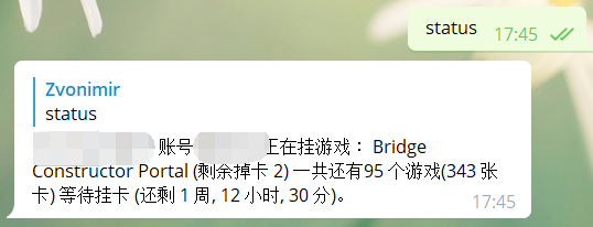 搜索刚刚你设定的 bot 用户名,并启用,你已经可以发送命令远程控制 ASF 了。这个机器人只有你能使用。