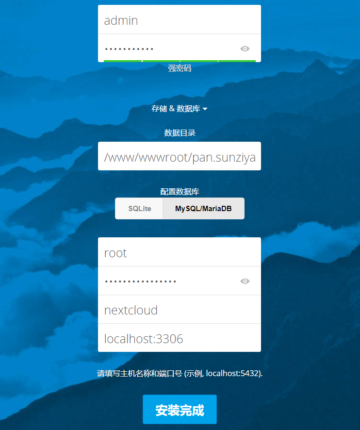nextcloud,密码为你设定的密码 - 数据库地址要加端口,如