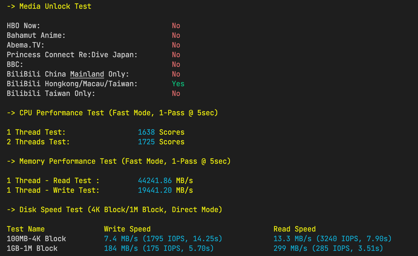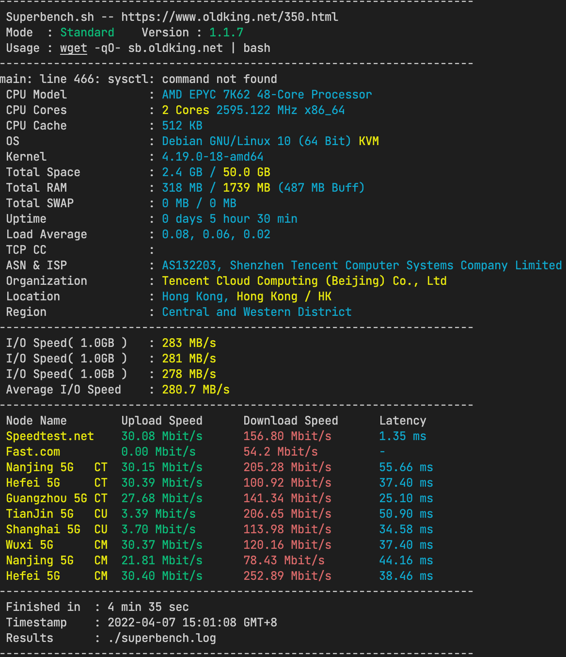 新整了个腾讯云香港轻量应用服务器 发表于 2022-04-07 Waline: 阅读次数: 本文字数: 96 阅读时长 ≈ 1 分钟 新整了个腾讯云香港轻量应用服务器测一下。 网络 后悔以前 CN2 线路的时候没留一台,现在是 163 线路,体验上其实还可以,至少不像阿里轻量到处绕。 Benchmark 用老鬼大佬的脚本跑了下,还是挺满意的。Fast.com 不知道为啥不通。 媒体解锁和性能测试